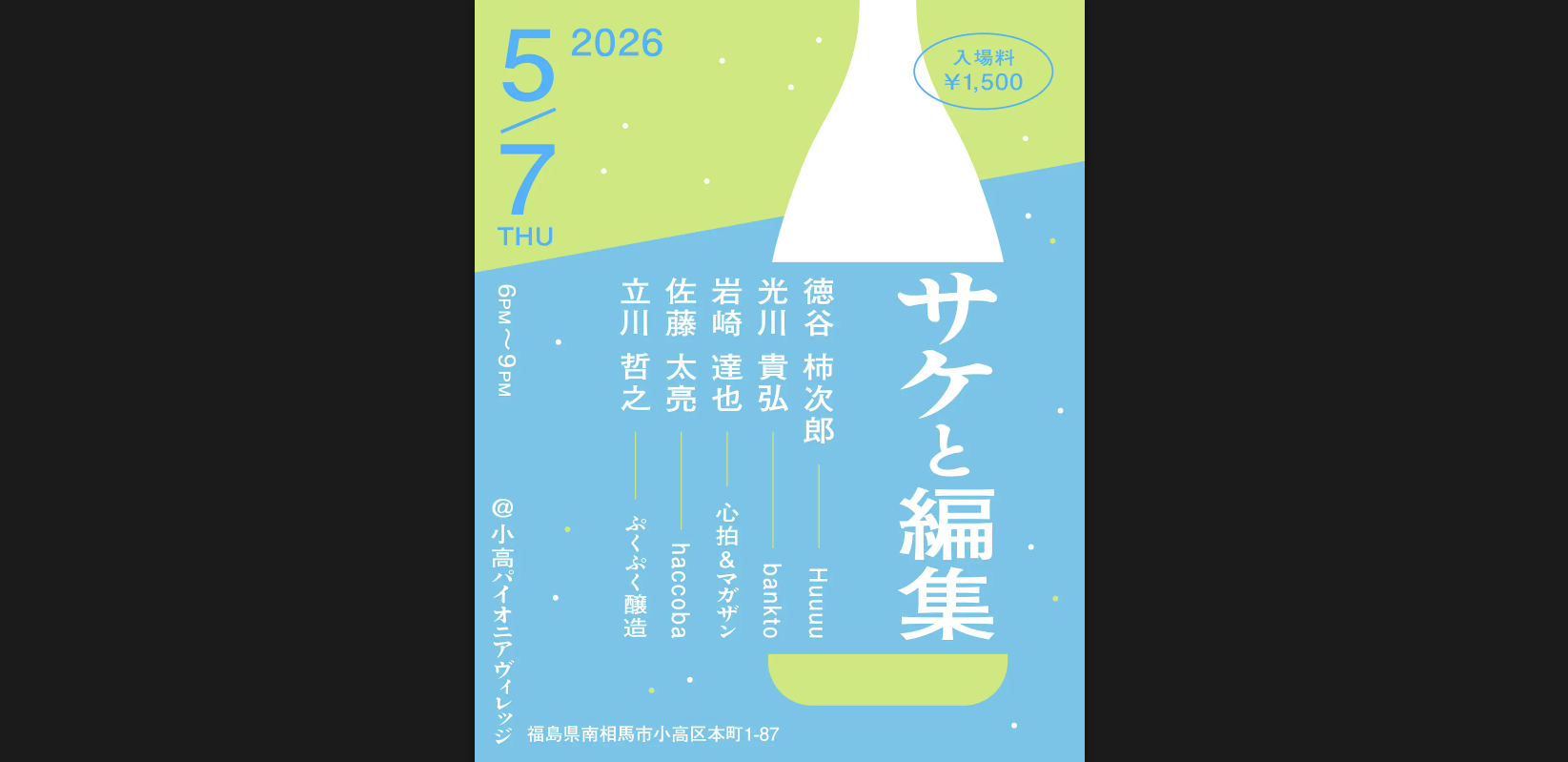 クラフトサケと編集ディレクションを行き来する彼を軸に、福島県南相馬のhaccoba・佐藤太亮、ぷくぷく醸造・立川哲之を巻き込んでクラフトサケを飲みながらの「サケと編集談義」を初開催します!